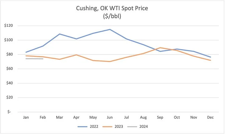In January, 2024, WTI crude averaged $74.15 and was relatively flat month-over-month with a 3% gain over the December average of $71.90. We are still -7% from the trailing 6 month average of $80.03, and -4% from the trailing 12 month average of 77.31. Overall, crude pricing has been relatively stable in the range of $70-80 per barrel. US production growth is finally flat-lining following historic gains made in 2023.